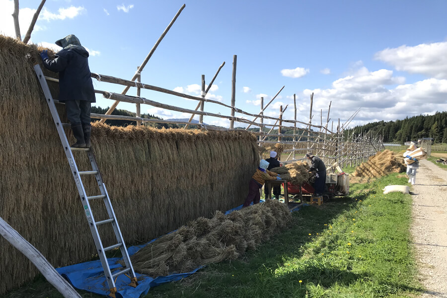 また、はさがけ米には「循環型農業」という副産物もあります。乾燥させた稲から脱穀(籾だけを選別)するとカラカラに乾いた状態の葉・茎が残ります。これがいわゆるワラ(藁)で、昔はこれで縄を綯(な)い、その縄でわらじを作ったり、むしろを編んだりしました。今でも牛を飼う農家さんにとっては、牛の餌や敷きワラとして活用されています。お米をハサにかけて天日乾燥させることでワラを得て、そのワラを食べた牛の糞尿が堆肥となって田んぼへと戻っていく。こうして循環型農業が成立するワケです。