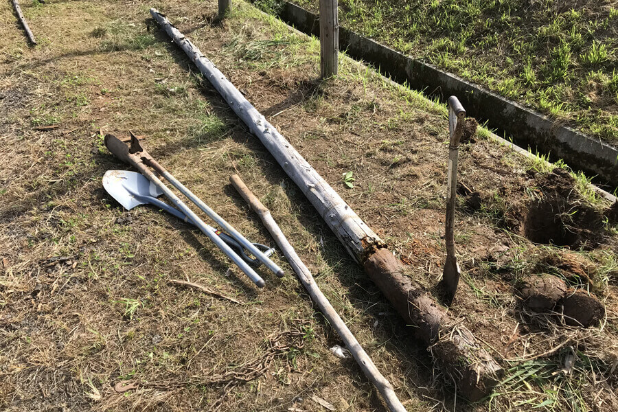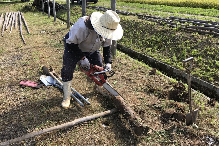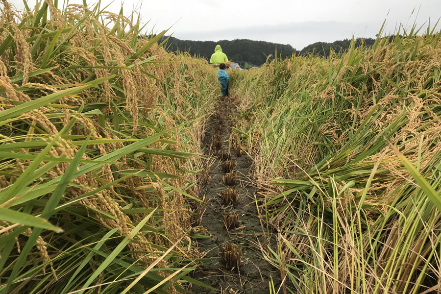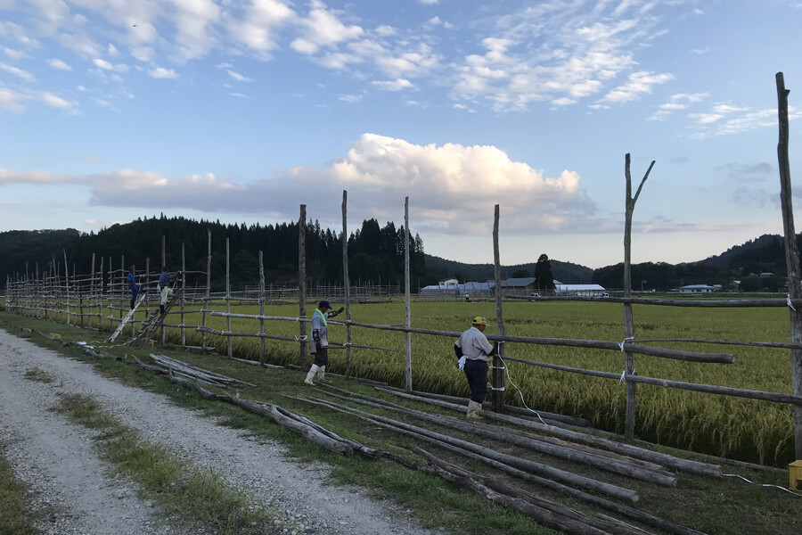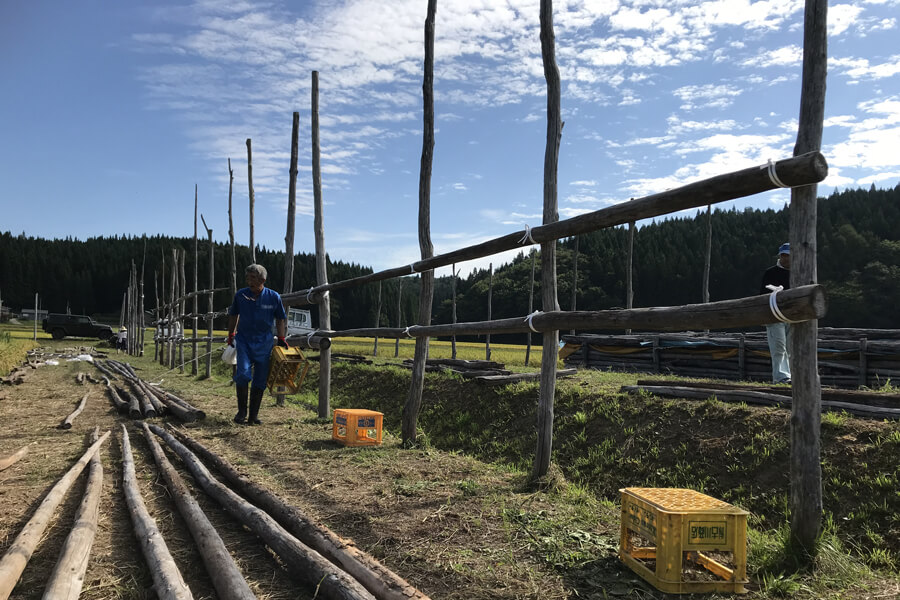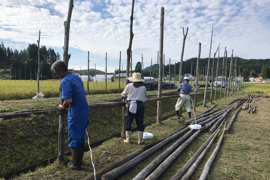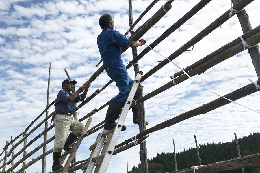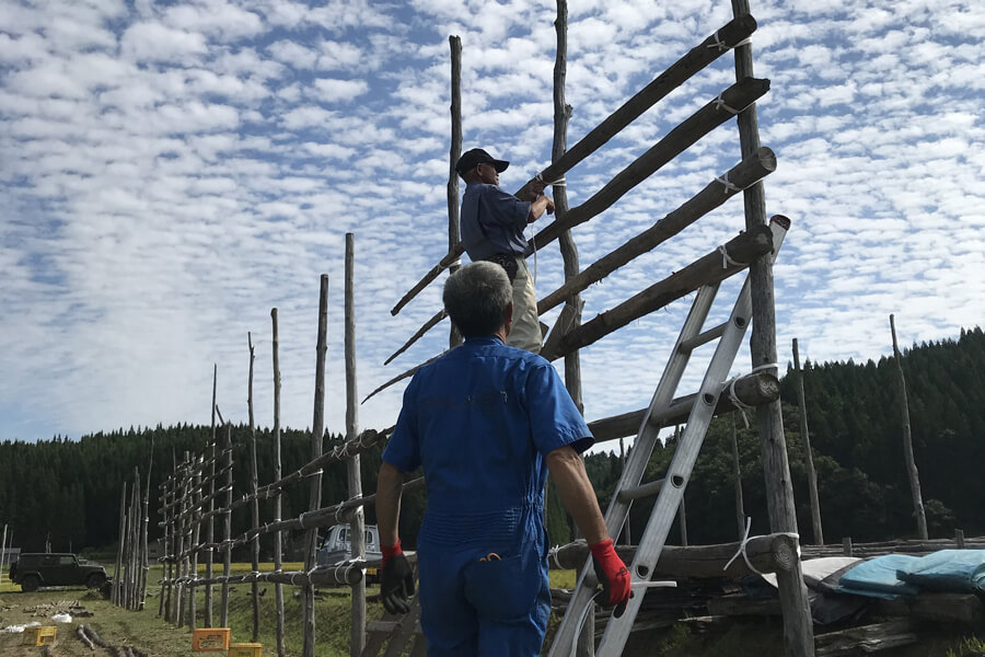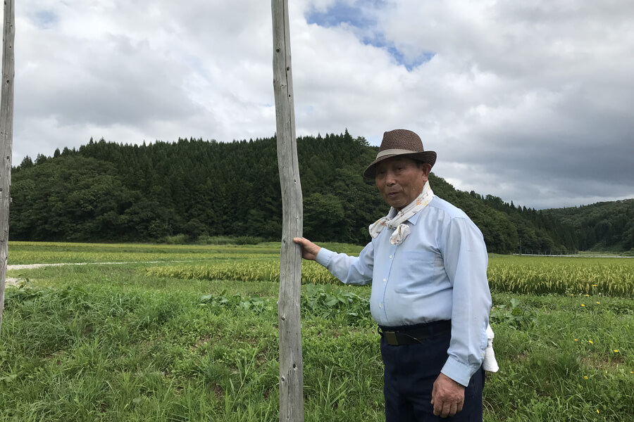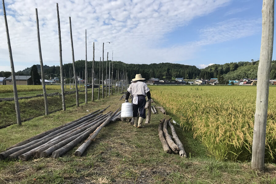 そして源一さんの田んぼの一番の特徴は、田んぼ全体をぐるりと囲むように設置された天日乾燥のための稲架(はさ)。9月中旬にもなれば稲をかけるための横木が渡され稲刈りを待ちます。この光景が源一さんのお米が他と違うことを如実に表しています。