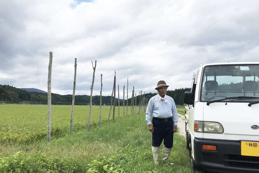 高橋源一さんはこの羽後町田代地区で代々続く米農家です。終戦後、GHQの農地改革によって小作農からこの地で自作農となり、今のこの田んぼでのお米作りはもう70年にもなります。ベゴ(牛)20頭を自宅横の牛舎で飼い、そのベゴの堆肥を米作りに利用することで有機以外の肥料を極力抑えています。10歳の頃からお米作りを手伝い始め、その経験と知識の蓄積は70年分以上。米どころである地元羽後町民や、車で一時間ほど離れた総合病院も病院食のために定期購入するほどの評判。